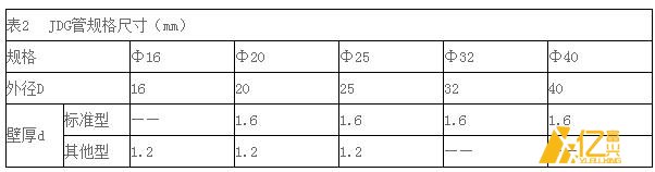 套接緊定式鍍鋅鋼導(dǎo)管,簡稱JDG管。導(dǎo)管采用優(yōu)質(zhì)冷軋帶鋼,經(jīng)高頻焊機(jī)組自動焊縫成型、雙面鍍鋅保護(hù);壁厚均勻,卷焊圓度高,與管接頭公差配合好,焊縫小而圓順,管口邊緣平滑;用配套彎管器彎管時橫截面變形小。導(dǎo)管出廠長度為4m,共有Φ16、Φ20、Φ25、Φ32、Φ40五種規(guī)格。標(biāo)準(zhǔn)型導(dǎo)管壁厚為1.6mm,預(yù)埋、吊頂敷設(shè)均適用;其他型導(dǎo)管壁厚為1.2mm,僅適用于吊頂敷設(shè)。見表2。